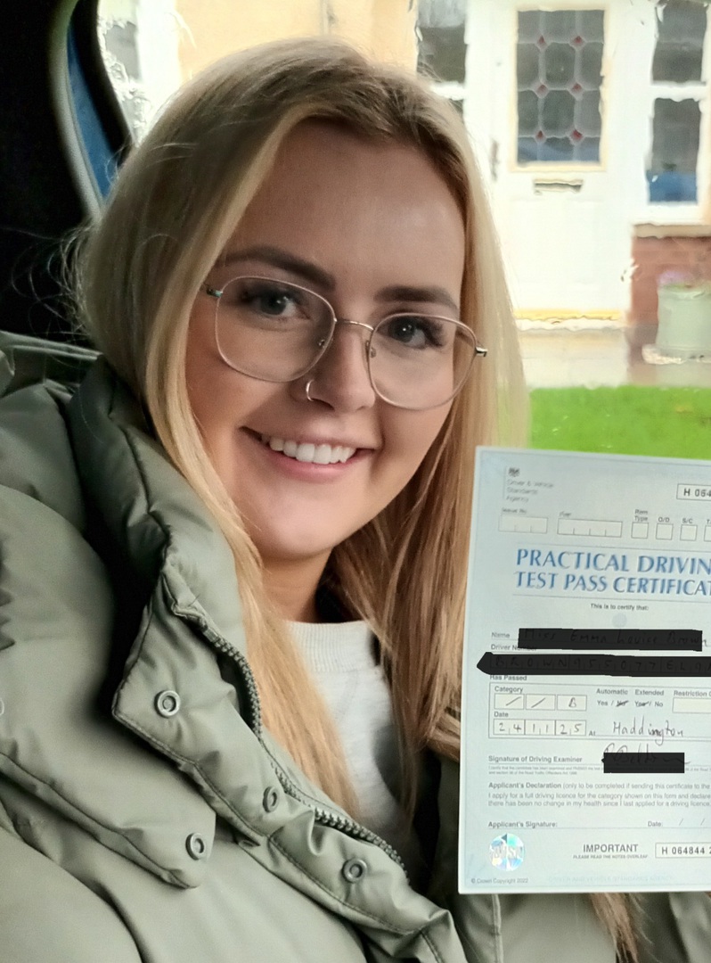 Emma passed her driving test with one driver fault(minor) at Haddington Driving Test Centre. The weather was not in her favour with heavy rainfall but it didnt dampen her spirits. She drove with confidence and received compliments from her examiner.